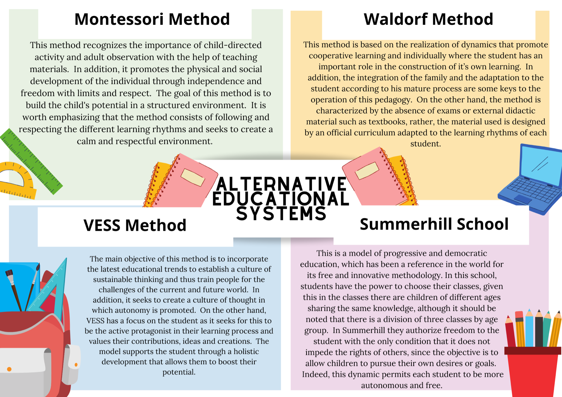 These examples are from educational systems and from a school recognized for its different way of thinking. They are distinguished for being educational models based on atypical pedagogical methods, created with the purpose of imposing difference between traditional systems.